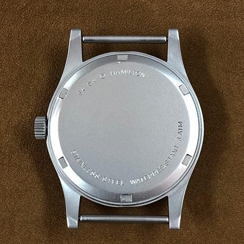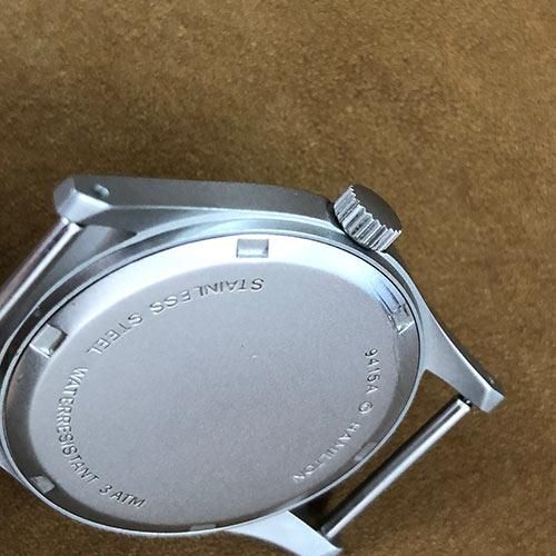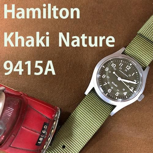 ハミルトンカーキには、様々なバリエーションが存在しています。かつて軍に収めていたMIL-W-46374 をベースにした手巻きムーブの9219、921980、9415、9415Aクオーツムーブの9797まで34mmケースサイズは継承されます。この、カーキ ネイチャーは9415A シリーズモデル、日付表示のないシンプルなダイヤル(文字盤)で手巻き。2002年頃に廃盤になっています。特徴は、ダイヤルがつや消しのオリーブドラブで、通常のKhakiのブラックダイヤルとの違いです。搭載されているeta 2801-2 ムーブメントは、非常にシンプルな構造で、Khaki シリーズのノンデイト手巻きモデルに多く搭載されています。自動巻用ローターアッセンブリーと日付がないため、自動巻きムーブメントよりも大幅に薄くなっているために、Khakiシリーズの11mm前後のサイズを実現させています。17石で手巻き、それだけに信頼性は高く、メンテナンスコストも抑えられるという利点があり、これから先のメンテナンスも心配の少ないムーブメントです。