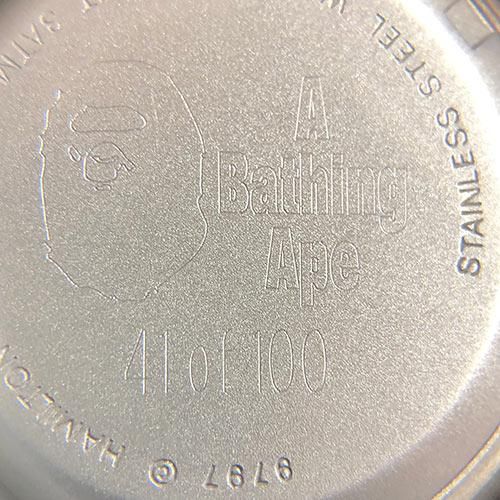 ストリートファッションブランド「A BATHING APE」と「HAMILTON Khaki」との100本限定、裏蓋にAPE HEADとエディション番号が刻印されたコラボモデルです。