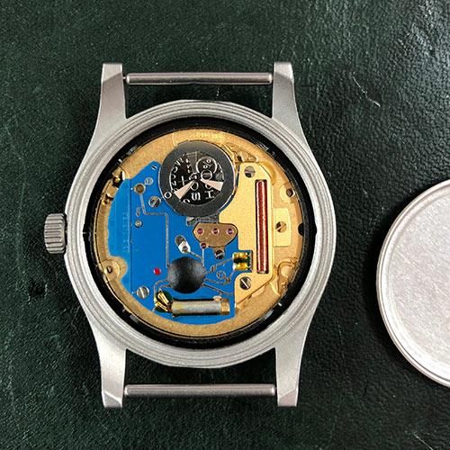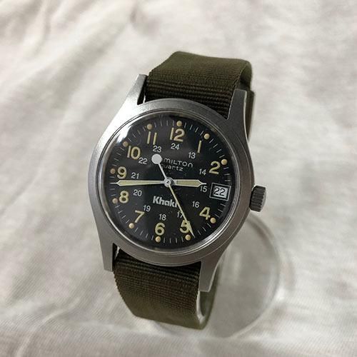 この個体はコレクターの長期保存品だと思われ、風防を含む33mmケースの傷もほぼ無く、何よりマットブラックのダイヤルに焼けもありません。前のオーナーが大切に保存した、使用感の非常に少ないデッドストックコンディションです。ベースは「9797」33mmモデル最終仕様のクオーツムーブメントで、eta.955.122という優秀なムーブメントを載せています。弊社でムーブチェックを済ませ、動作確認済で、初期のKhakiに見られる中蓋の入った貴重なモデルです。