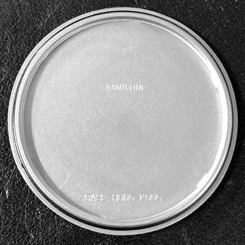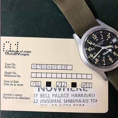 「XX/100」のエディション番号も裏蓋に刻まれています。外箱やBAPE原宿での購入時の保証書、HAMILTONプラタグもオリジナル。当時の付属ベルトは、残念ながら留め具部分が剥離し、金具部分に緑青が出る当時のKhakiによくある状態で使用できませんので、当時純正NATOの新品のオリーブドラブをお付けしました。