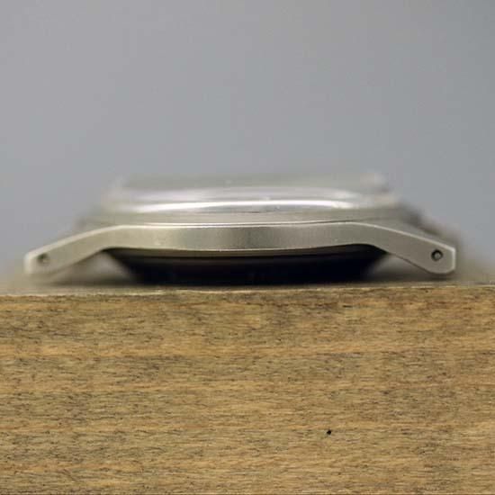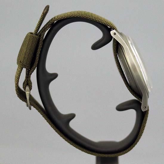 この個体は、今ではほとんど量産されることのないパーカー処理されたケースにCal.649というeta.2750 ベースの17石手巻きムーブメント。ダイヤルは、トリチウム夜光の発光機能は失われていますが、太めのアラビア数字に経年劣化もなく、12時位置上に小さく隠れるベンラスの特徴のトリチウム「T」マークもきちんと残っています。また、リューズもベンラスミリタリーオリジナルの「―」マークも残った最後のベンラス、貴重な逸品です。
