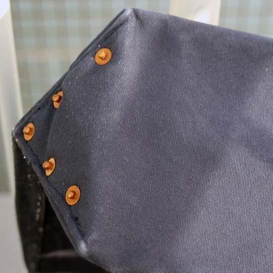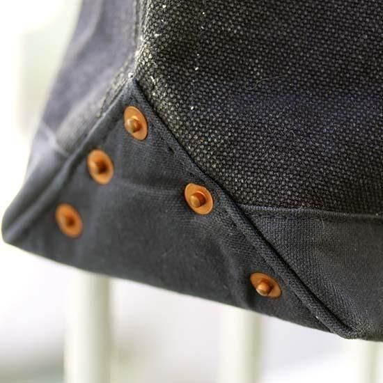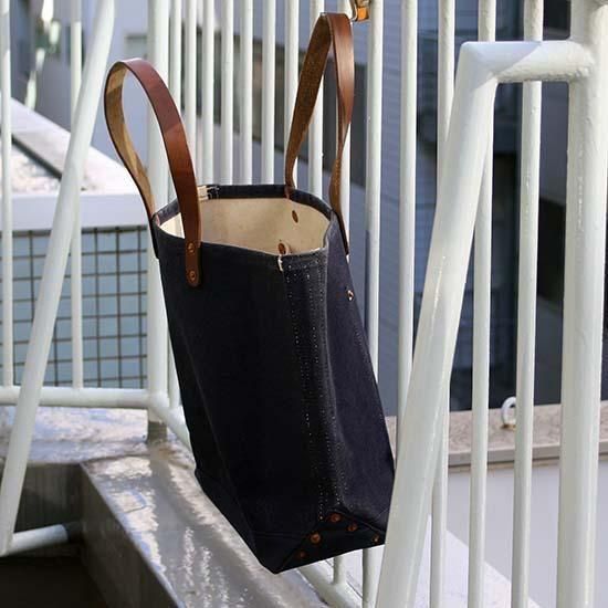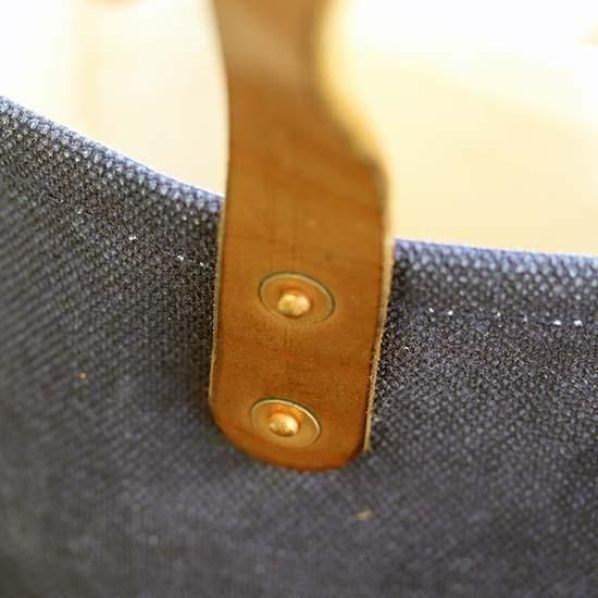 超ヘビーデューティーな帆布製トートバッグは、銅製11mmの補強リベットを肉厚のヌメ革ハンドル左右に4個づつ、粗めの帆布ボディのポケットに2個、底の左右に5個づつ、合計20個も打ち込んでつくられた、完全にオーバースペックな逸品。